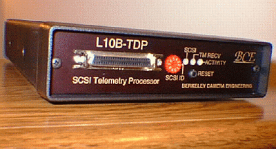 The L10B Telemetry Data Processing unit is a SCSI based peripheral unit designed and manufactured by Berkeley Camera Engineering. The L10B utilizes the SCSI-DSPX board in a 5 1/4 sized box. It is capable of transmiting byte data to and from RS 422 data and clocking signals, and DMA's into the DSP's Sram which is then buffered out and sent to the SCSI bus or back across the RS 422 port.